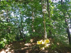陣笠山から緩い登り降りの稜線歩きとなり、薬師岳への最後の登りは短い急坂となる。薬師岳の頂上は樹林に囲まれて展望は全くない。刀の試し切りの俵のような梵天が建てられていた。頂上付近には薬師如来の石碑 もあるそうだが、うっかり見逃してしまった。