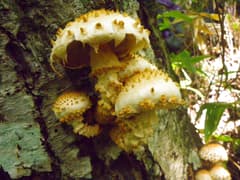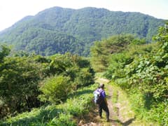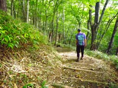 厚生団地(企業や地方自治体の山荘が立ち並ぶ一帯)の一角を通り抜けて、再び山道に入る。小尾根を登る道は樹林に覆われて、軽ハイキングのコースにしては意外と山奥の感じがする。気持ち良い山歩きだけど、二日酔い気味なのが気持ち悪い(^^;)。
