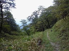 やがて水流が途切れ、地面から水が染み出している地点に着く。ここが安倍川の水源らしい(標識があった)。しばらく水の無い窪を歩くと、旧道の安倍峠に着く。オオイタヤメイゲツというカエデの一種が群生しているのをはじめ、樹林が美しい峠だ。紅葉の時期にはまだちょっと早かった。ここから大光山(おおぴっかりやま)への登山道が分岐する。この面白い読みがなの山にも、大いに興味を惹かれる。