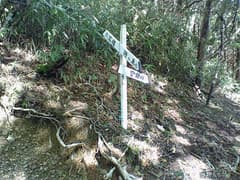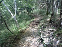 新安倍峠から山道に入り、稜線上を急登する。樹林に覆われたピークを越えると稜線から下がって、山腹をトラバースする道となる。下から登って来たショートカット道と合流して稜線に出ると再び急登となり、尾根を絡んでジグザグの登りが続く。ところどころザレた斜面を横切る箇所があり、滑落しないように注意。