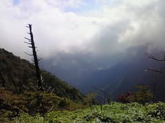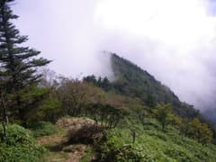 下山は往路を戻る。ガスは一様に真っ白で、晴れる気配はなかったのだが、稜線上の小さな笹原にさしかかったところで幸運にも一瞬ガスが切れて、遥か下に梅ヶ島温泉近くの安倍川の河原が見えた。