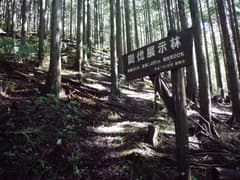 安倍峠に向かう車道を少し登ると安倍峠・八紘嶺登山口の道標があり、ここから山道に入って急峻な山腹の杉林の中をジグザグに登る。途中、間伐展示林という案内板があり、そのとおりに綺麗に手入れがされた杉林が続く。また、今日も間伐の作業中で、辺りにはチェーンソーの音が響き、杉の木の香りが充満していた。急斜面での林業の作業は大変そうだ。