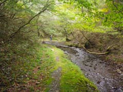 車道の途中に安倍峠への旧歩道入口の道標があり、ここからサカサ川に沿って山道を歩く。U字の小さな谷はほとんど平坦で、ヒタヒタと流れる谷川の脇に道が通じている。先行するハイカーさんの後について、のんびり歩く。