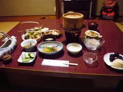 いよいよ食事が部屋に運ばれて来ました。どひゃー、すごいご馳走!美味しい。もう大満足。明日はもうひと山登る計画だったが、予報によると雨が降るそうなので、始発の朝9時台のバスでおとなしく桐生に帰るつもりだ(10/2の晩に記す。予定通りに帰桐。推敲してアップ)。
