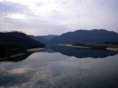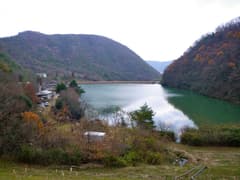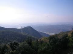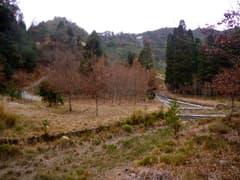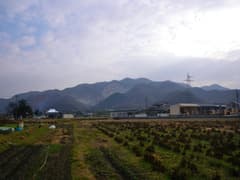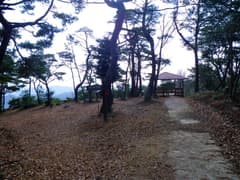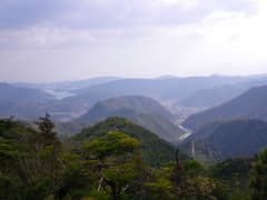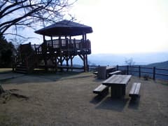 広場の一角には管理棟があり、立て看板によると、元旦には初日の出を見る人をお雑煮・甘酒・焼き餅で接待してくれるそうな。今日はなんにもなくて残念(^^;)。その裏手には展望台の東屋とベンチがある。あまり高い山はないが、うねうねと広がる山並みとそれを縫うように流れる大河の眺めは、群馬とは様子が違っていて目新しい。