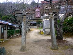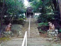 折角なので、登山の前に八幡宮にお参りしよう。山門を潜って石段を登ると、陶器製の狛犬に迎えられて、無住の社殿に着く。境内が常緑樹の森に囲まれているのが、如何にも温暖な西日本という感じだ。ただし、今日は結構風が冷たい。