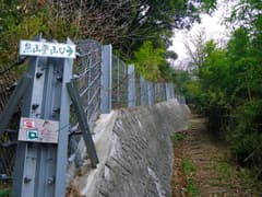 尾根に出ると、緩い尾根道の登りがしばらく続く。四合目の標識を過ぎると、尾根の右を絡んで登る道となり、山麓に大きく弧を描いて流れる吉井川が眺められる。登山道は龍神山を左から巻いているが、巻き道から分れて龍神山に登る踏み跡があり、その入口に「私の名所 龍神山岩壁」という手製の道標がある。四つん這いになって崖下を怖々覗き込む人物のイラスト付きで、これを見たら行って実際に見たくなった。