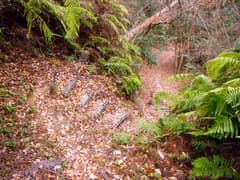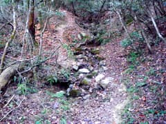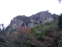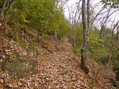 谷に沿って下る道からは樹林に遮られて良く見えないが、左上は屛風岩という大岩壁になっていて、道には岩が散乱している。落石に要注意。