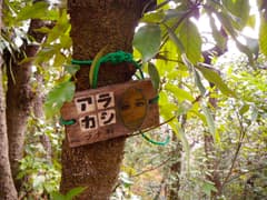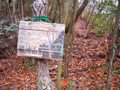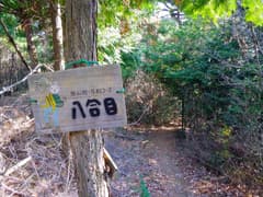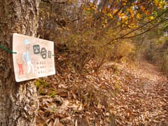 山門に戻り、「弓削古道登口」という手製の道標を見て登山道に入り、樹林に覆われた山腹を斜めに上がる。樹木に名札が付けられていて、ブナ科のアベマキやアラカシと書いてある。同じブナ科でもアベマキは落葉樹、アラカシは常緑樹と違うとは、豆知識をゲットだ(^^)。道標も山名標も、手書きのうまへたなイラスト付きのもので、見ていて面白い。