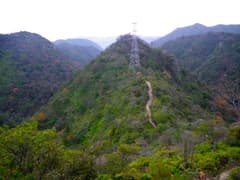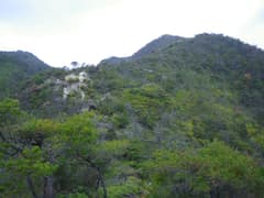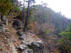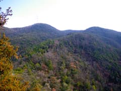 見晴台の先は尾根上の急な下りとなる。のったりとした熊山頂上とは一変して、尾根と谷がなかなか急峻だ。岩と白いザレが多いせいか植生も低い松が多く、周囲の眺めがきく。鞍部に下って左に林道鬼ヶ城線への道を分け、送電鉄塔の建つ鋭峰に向かって直進する。