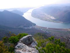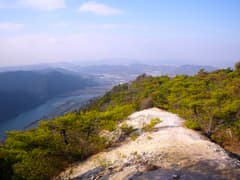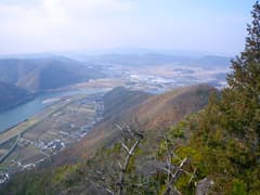 という訳で尾根を登ると、数分で龍神山の頂上に着く。頂上は樹林に囲まれて狭く、朽ちかけた祠と「龍神山 344」と書いたイラスト付き山名標がある。頂上直下には岩場が突き出た場所があり、その下は断崖絶壁だ。そして、急傾斜で吉井川まで切れ落ちており、標高の割には高度感がある。これは確かに名所と言っても良い。