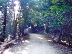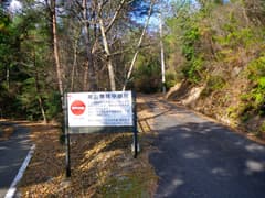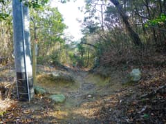 単調な林道をさらに歩き、麓へ下る林道大滝線と分れて、ようやく尾根道に入る。この辺りは備前市が森林公園として整備しているらしく、尾根道も簡易舗装されて、両脇の樹木も剪定が行き届いている。三角点(点名大滝山、標高426m)の少し先に「伊部駅→」の古い道標があり、ここから伊部(いんべ)に下る。