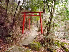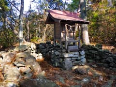 鞍部に戻って先に進むと、直ぐに未舗装の林道に出る。林道の終点に向かって「南山崖遺跡 500m」という道標があり、興味を惹かれたが、ちょっと遠いので割愛。林道を横断して樹林の中を進むと、今度は「鍛冶神社100m 刀匠が信仰した神社」という道標があり、枝道がある。これは訪ねてみると、石積みの上に小さな祠が祀られていた。