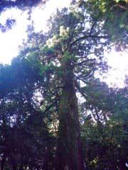 元の道に戻り、2本目の林道を横断する。その先は杉の巨木の林に入って急に神さびた雰囲気となり、幅広い参道に合流する。ここまでは誰にも会わなかったが、参道はハイカーさんがちらほら行き来している。注連縄が巻かれた特に大きな杉2本は、「熊山天然杉二本」として赤磐市の天然記念物になっているそうだ。説明板によると樹高38m、幹の直径1.5m、幹の周囲4.5m、樹齢約千年とのこと。