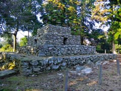 参道の終点は杉林に囲まれた広場になっており、その周辺にいろいろな宗教モニュメントがある。まず、珍しいのが熊山遺跡(国指定史跡)で、割石を4段に積み重ねたピラミッド様の建造物である。説明板によると、奈良時代前期に築成された石積みの仏塔と推定されるものとのこと。その他、鐘楼跡や観音堂跡、五輪塔、延命地蔵菩薩(これは最近のもの)、猿田彦神社がある。