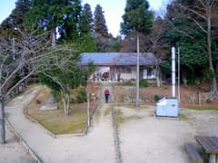 八幡宮の鳥居を潜ると、陶器製の二宮尊徳像と弓削小学校跡という石碑があり、古くて小さな校舎とこぢんまりとした運動場が残っている。熊山への登山道は、八幡宮の山門の前から斜め右上に通じている。