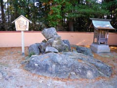 参道を戻り、次は熊山の本峰にある熊山神社に登る。立派な石段を上がって鳥居を潜ると、開けた境内に着く。こちらの社殿は、明治の神仏分離で創建されたもので、比較的新しい。両脇に控える狛犬は、やっぱり陶器製だ。境内には「児島三郎高徳挙兵(1336年)の跡」と称する岩もあり、なんでも太平記に出て来る場所らしい。