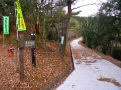 熊山神社で史跡巡りは一段落。参道から車道に出ると、しばらく車道歩きが続く。途中、熊山の三角点に立ち寄る。熊山の頂上は熊山神社のようで標高も僅かに高いが、三角点のあるピークも気になるものだ。頂上はNTTドコモの巨大な無線中継所に占拠されているが、その一角に三角点の標石があった。これで気分もスッキリ。