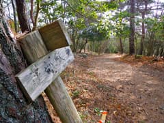 展望を楽しんだのち、尾根を直進して登山道と合流する。白砂青松といった感じの展望の良い尾根道を登ると、六合目の標識がある。尾根から外れて浅くて緩い谷を登り、「清盛」という道標のある鞍部に着く。