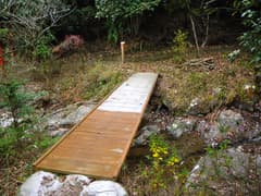 送電鉄塔から右へ急降下し、広い谷の底に着く。1997年刊のアルパインガイドには鬼ヶ城湿原と記載されている場所だが、水害のために埋もれたらしく、そこここに真新しい護岸や堰堤がある。現在は親水の森と称しているようだ。