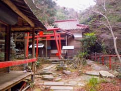 沢を渡ると参道に出る。右に少し登ると沢山の赤鳥居を潜って高倉大明神に着く。ここのお稲荷様もまた陶器製だ。立派な社務所があるが無人で、最近使われた形跡はどうもなさそう。社殿の前から屛風岩を仰ぐことができる。この光景を見ると、屛風岩を信仰の対象としていることが自然と判る。社殿の奥には小さな滝があり、不動明王が祀られていた。