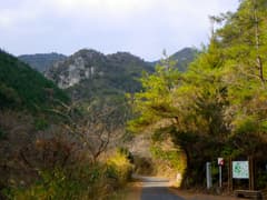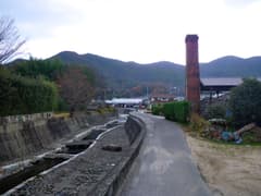 参道を戻って下ると林道鬼ヶ城線に合流し、あとは舗装された車道を下る。振り返ると屛風岩が良く見える。二つの溜め池を過ぎると、伊部の町並みに入る。伊部は備前焼で有名で、煉瓦作りの四角い煙突があちらこちらに立っている。これだけの数の煙突がある風景は今や珍しく、懐かしさを感じる。