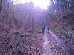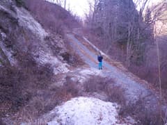 対岸の道は未舗装で、凸凹が惨い。最初のY字分岐は左へ。廃業した?石材店を過ぎ、その次の十字路は迷った末、直進する。暗い谷間の急坂を登ると、路面がコチンコチンに凍結していて、スタッドレスが空転。もう進むのは無理だ。道の脇のスペースに車を置いて、ここから歩くことにする。