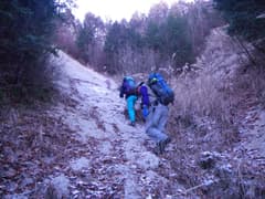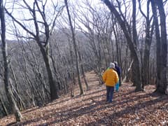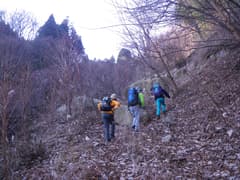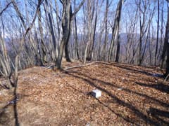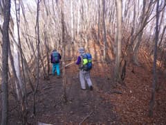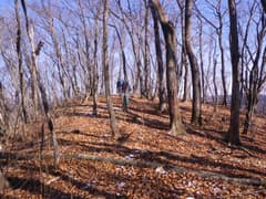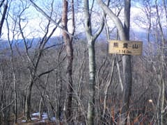 大岩から尾根を緩く登ると、白浜山に登り着く。雑木林に囲まれているが、冬枯れのこの時期は明るく開けている。三角点の辺りの腰を下ろし、お湯を沸かしてMさん持参のカレーヌードルを食べる。あったかい食べ物がおいしい。