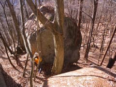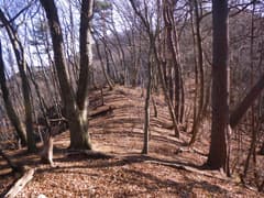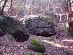しかし、稜線上は北風が吹き抜けてさすがに寒い。防寒にフリースを着込んで、白浜山に向かう。落葉した雑木林の尾根は明るく、気分が良い。この辺りに、天狗の太刀割り石という大岩があるということで、探しながら稜線を歩くと、右側の雑木林の斜面を少し下ったところに大きな岩場があった。巨岩が集まっていて、二つに割れたものもある。これが天狗岩だろうか?