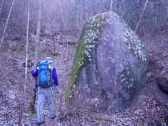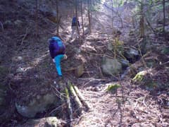 沢に沿って登るにつれ、だんだん植林の小枝が煩くなって来るが、踏み跡は続いている。左の枝尾根は低く、すぐに上に出られそうだが、この沢を詰めてみる。行く手に稜線が見え、源頭に近づくとタマゴ形の大石が現れる。