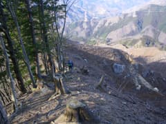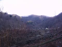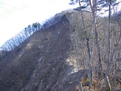 白浜山に戻り、北東に延びる尾根から下山にかかる。一度、通ったことのある場所で先頭を歩いていたら、どうも様子が記憶と違うなー。と思ったら、方向が違う尾根を降りかけていた(←コラコラ)。急な山腹を冷や汗かいてトラバースし、正しい尾根に戻る。少し下ると、北側斜面が広大な範囲で伐採された個所に出る。谷底まで遮るものがなく距離感が狂うが、かなりの標高差と傾斜があり、滑落注意。