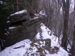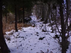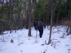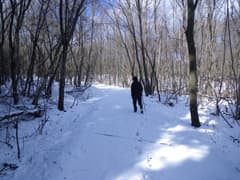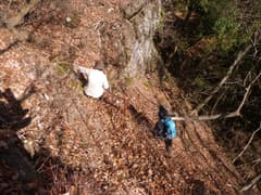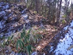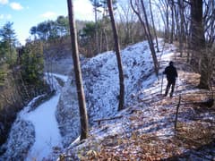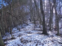やがて、小高いピークにぶつかって、急な坂に差し掛かる。雪がなければどうということはない登りだが、固く凍った斜面は滑り易く、立ち木が疎らで手掛かりも少ない。ここで、S&Sは登るのを断念。頂上まであと僅かの距離なので、二人にはこの坂の下で待って貰って、私だけ往復する。
