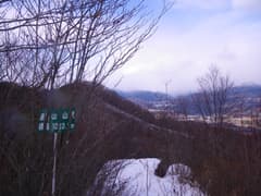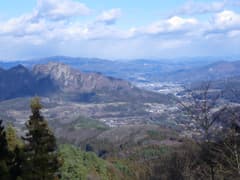 新しい林道は、稜線直下をばっくり削って続いている。林道自体は殺風景だが、伐採されたおかげで北面の展望が開け、岩櫃山から薬師岳、吾嬬山にかけての山並みや、中之条の町並みが一望できる。