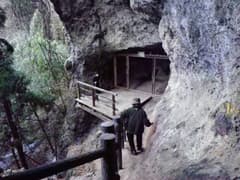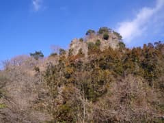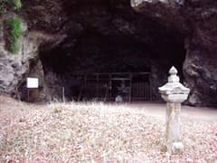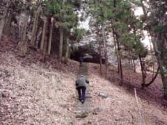 入口から杉林の中の長い石段を登ると、行く手に岩峰と岩壁がぐるりと立ちはだかる。まず、右側の岩壁に行くと、その基部に洞窟がぽっかりと大きな口を開けている。
