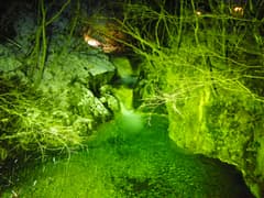 仙人窟の探訪を終えて、たんげ温泉に向かう。宿に到着する頃には上空を灰色の雲が覆い、雪がちらほら舞い始めていた。美郷館に入ると、まず木造の広いエントランスにビックリ。置かれている一枚板テーブルもでかい。泊まった部屋には掘り炬燵のある広縁があり、窓の外にライトアップされた渓流と滝を眺めることが出来る。