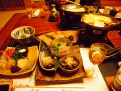 まずは、温泉へ。一番大きな瀬音の湯に入る。浴室も立派な木造だ。天井が高いので空気が冷たいが、ぬるめの湯船にゆっくり浸かるとよく温まる。風呂上がりにビールを飲み、夕食時に熱燗を飲んだら気持ち良く酔いが廻って、紅白も見ずに眠ってしまった。