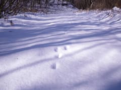 今日はコンロとコッヘルも持って出発。入口に鎖が張られた左の林道を進む。冬枯れの雑木林は、陽が差し込んで明るい。雪の上には兎の足跡が続いている。そういえば、今年は卯年だった。こいつは春から縁起がいい、ってことはないか(^^;)