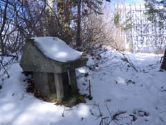 北側が小さな崖になった細尾根を進み、破風山の頂上に着いた。頂上には電波反射板があり、少し南の林間に三角点の標石と石祠がある。