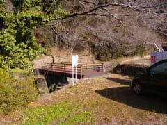中之条からR353を渋川方面に走り、岩井洞ドライブインの先で左に分岐する車道に入ると、すぐに左の沢に赤い鋼鉄の桁橋が架かっている。ここが岩井堂砦の登山口で、見上げると険しい岩峰がそそり立つ。岩稜には道らしきものが見え、どうもあそこを登るらしい。橋の手前に車を置いたが、渡った先にも広い駐車スペースがある。