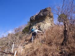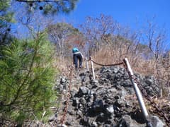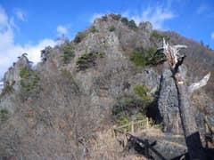 登山道に入り、林間の階段を急登して、右手の岩稜に取り付く。鎖が手摺に張られているので、摑んでいれば問題はないが、登って行くとぐんぐん高度感が出て来る。