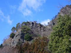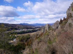 登り着いた砦頂上は柵に囲まれた平地にベンチや小さな休憩舎があり、安全地帯なのでホッと一息つける。展望は抜群で、眼下を流れる吾妻川を上流から下流まで見渡せる。お隣りには、2つの岩峰が突き出た古城台が眺められる。余裕があればあちらにも登ろうと考えていたが、岩井堂砦だけでもう充分満足だ。背後には岩井堂山がごつごつと聳えている。これはエキスパート向きで登るのは難しそう。
