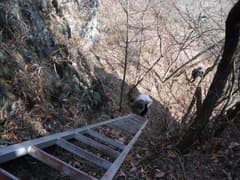 展望を堪能し、充分に休憩して気持ちを落ち着けたのち、下山にかかる。岩稜から梯子で降りて、急な岩の斜面をジグザグに、手摺の鎖を頼りにしてそろそろと下る。