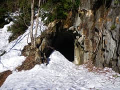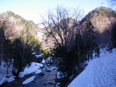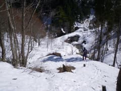 宝川沿いの林道を歩き始めると、直ぐに厚い雪が路面を覆う。宝川は雪解けで水量が多く、ドウドウと流れている。豪雪地帯の川沿いの林道歩きと言えば、十字峡から三国川沿いの林道を思い出す(山行記録)が、あそこのように川に落ちたら一巻の終わり的危険個所はない。もっと早い時期でも、問題なく歩けそうだ。