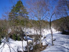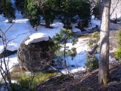 下山は往路を戻る。雪の下りは本当に楽だ。下るに連れて往路のトレースは融けて不明瞭になるが、ルートは適当で問題ない。ずぼり始めた雪をざくざくと踏んで、板幽橋に着いた。