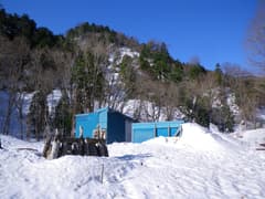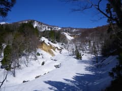 早朝なので雪はまだ固く締まっており、長い林道歩きも周囲の雪景色を眺めてのんびり歩けば苦にならない。トンネルを抜けると宝川に広い滑床が現われ、球形の大岩が立っている。送電線巡視路を右に見送ってしばらく行くとゲートがあり、周囲にトタン囲いの小屋と「宝川理水試験地」という看板、昭和53年建立の観音像がある。看板の説明によると、ここから上流の一帯は、奥利根の天然林の開発と水流出の関係を調査するフィールドになっているらしい。