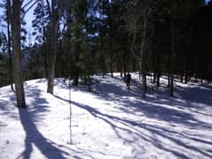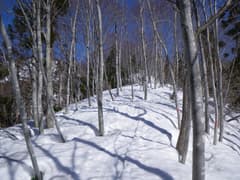 ゲートからさらに20分程歩くと、登り口の板幽橋に着く。小休止して、ワカンを着ける。ここから板幽沢左岸の緩斜面を登る。雪がべっとりと残る杉林の中に適当にルートをとる。左手に板幽沢が見え隠れするような感じで、顕著でない小尾根を辿る。ところどころに、最近登った足跡を見かける。