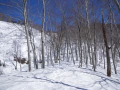 板幽沢の奥を眺めると、真っ白な稜線が高々と聳えている。最初、朝日岳辺りかなと思ったが、実は布引山の南尾根が見えていたようだ。目印となる物の少ない雪山は、距離感、スケール感が狂う。平地を突っ切って、少し急な登りの小尾根に取り付く。疎らなブナ林の中、程よく締まった雪を踏んで至極快適な登りだ。