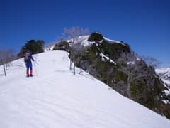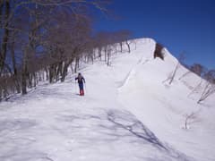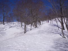 やがて細尾根に乗ると、スキーの登りトレースがあった。若いブナが密に生えているので、この辺りのスキー登降は少々しょっぱそう。スキーならば、右手の浅い谷の中を登る方が楽そうだ。