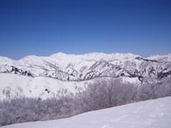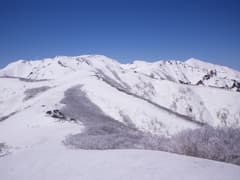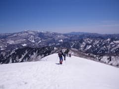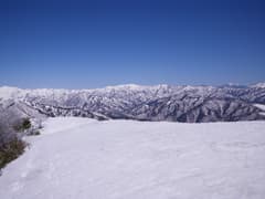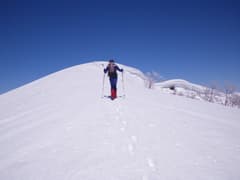 最後は木立のない真っ白な稜線を登ると、誰もいない雨ヶ立山の頂上に着いた。頂上からの展望はまさに360度。まず、眼前に横たわる布引尾根と、朝日岳から大烏帽子山、そして遥かに巻機山まで連なる白銀の連峰の眺めがド肝を抜き、スキーヤーなら垂涎物の大斜面が広がる。