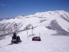 斜面を背にし風を避けて腰を下ろし、この大パノラマを見ながら缶ビールを開ける。朝日岳の左には谷川岳、天神平、先週登った阿能川岳、吾妻耶山の稜線が折り重なり、その後ろには白い浅間山が遠望できる。さらに榛名山、赤城山、武尊山と、群馬県北の山並みが続く。利根川源流を取り囲む主な山は、ほぼ全てが眺められる。